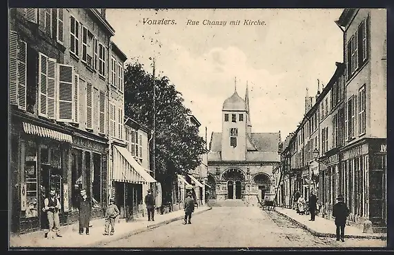 AK Vouziers, Leipziger Strasse (Rue Chancy) mit Kirche
