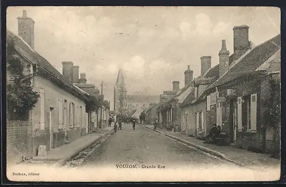 AK Vouzon, Grande Rue animée avec vue sur l`église au fond