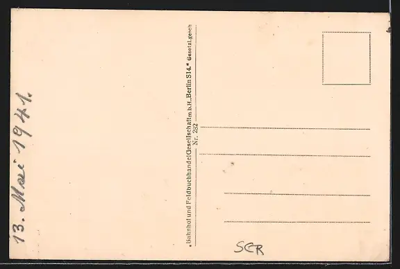 Personenbezogene Daten auf der Rückseite der Karte wurden durch blauen Textmarker unkenntlich gemacht. Die blauen Stellen sind auf die Vorderseite durchgeweicht und wirken sich negativ auf das Postkartenfoto aus
