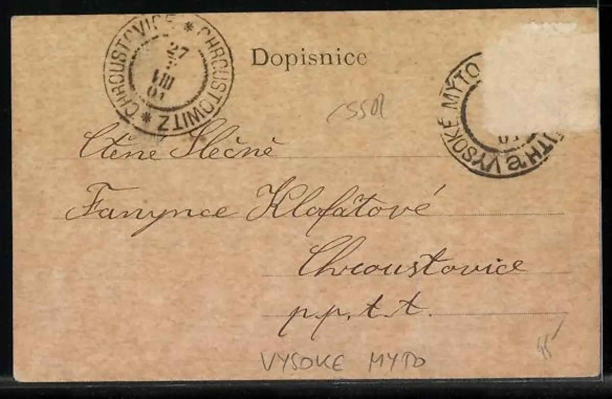 gelaufen 1901, Briefmarke entfernt, rückseitig Oberflächenschaden, Bugspur vert. unten li., guter Zustand
