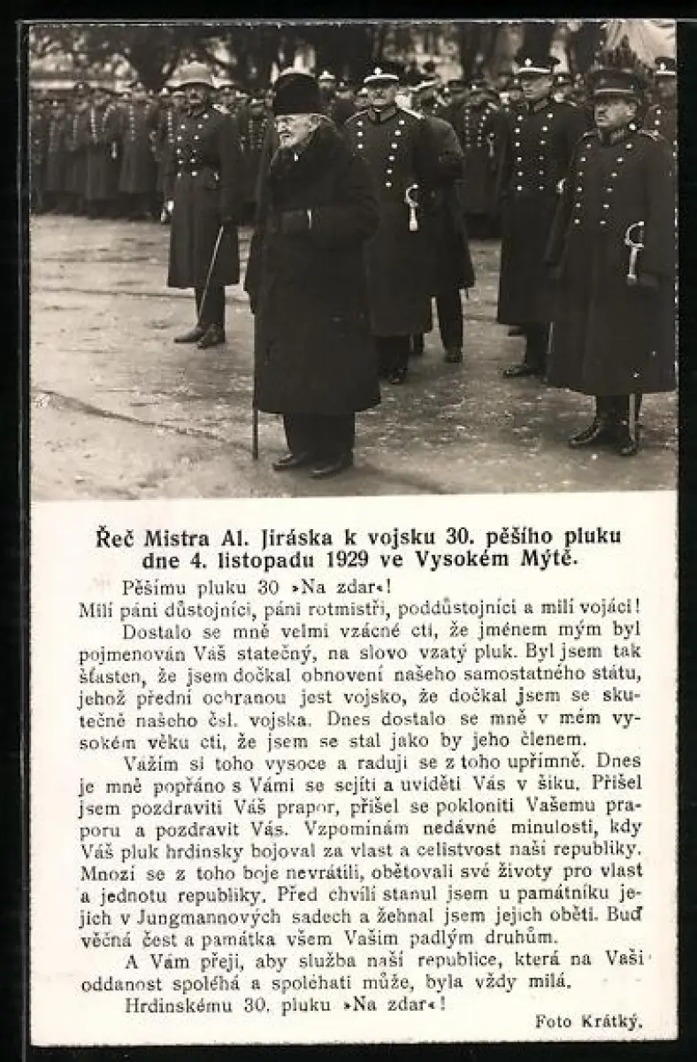 AK Vysoke Myto, Rec Mistra Al. Jiraska k vojsku 30. pesiho pluku dne 4. listopadu 1929