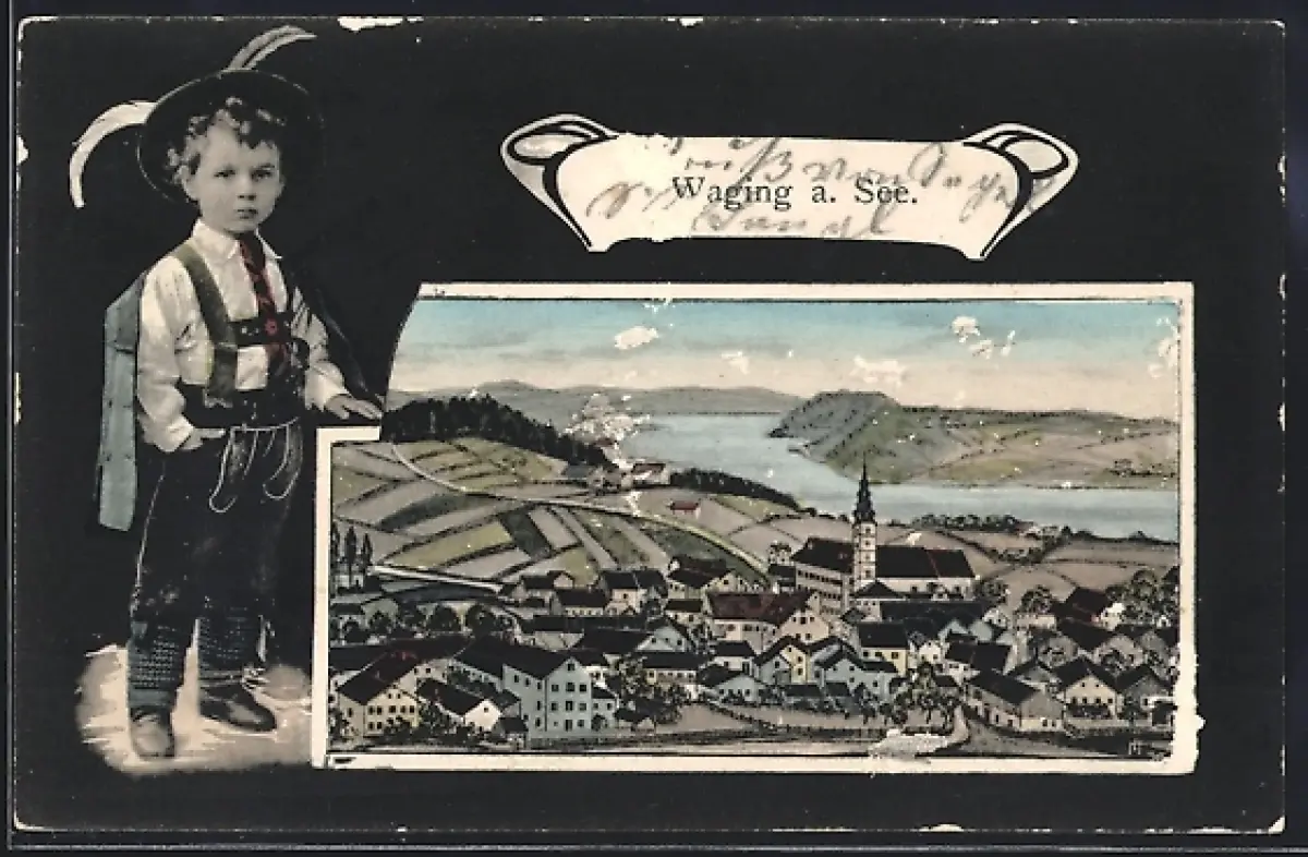 AK Waging a. See, Totalansicht, Bub in bayrischer Lederhose