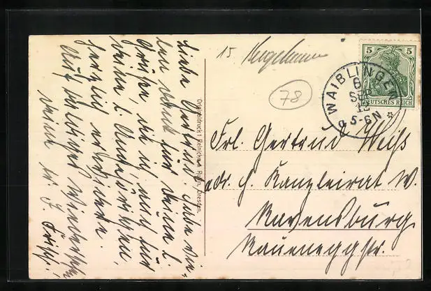 Personenbezogene Daten auf der Rückseite der Karte wurden durch blauen Textmarker unkenntlich gemacht. Die blauen Stellen sind auf die Vorderseite durchgeweicht und wirken sich negativ auf das Postkartenfoto aus