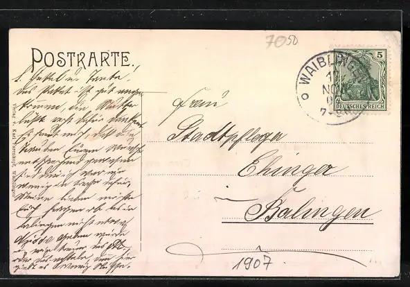 alte Ansichtskarte, gelaufen 1907, Eckknicke li. oben u. re., Oberflächenschaden, guter Zustand