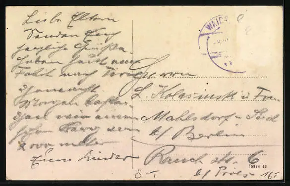 Personenbezogene Daten auf der Rückseite der Karte wurden durch blauen Textmarker unkenntlich gemacht. Die blauen Stellen sind auf die Vorderseite durchgeweicht und wirken sich negativ auf das Postkartenfoto aus