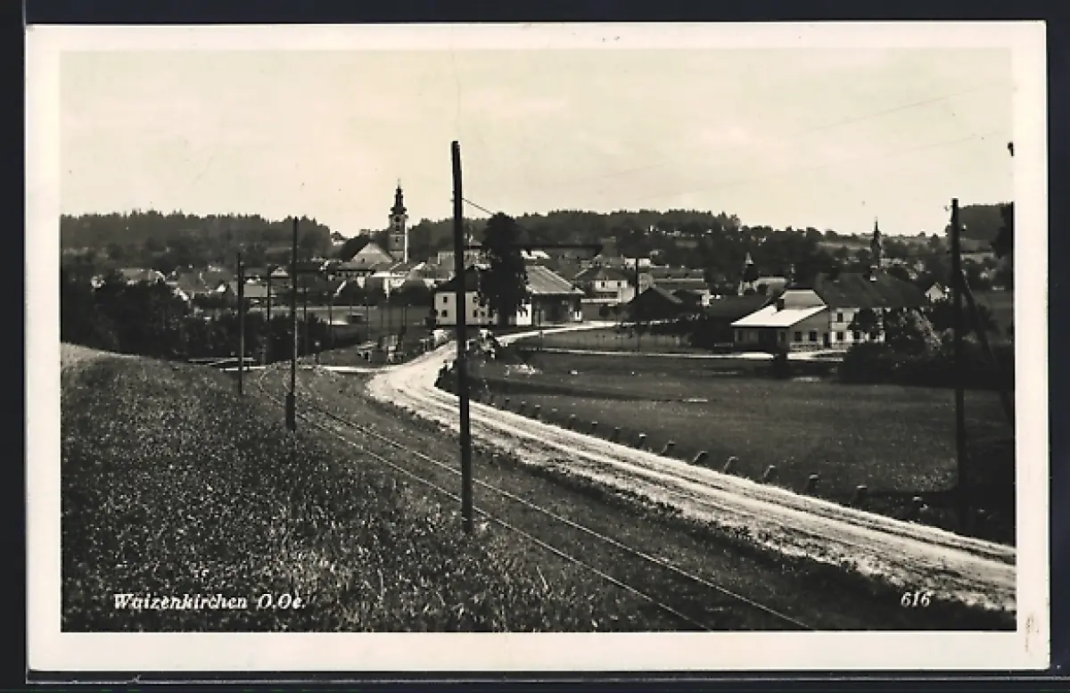 AK Waizenkirchen, Blick zum Ort hinüber mit Landstrasse und Eisenbahnschienen