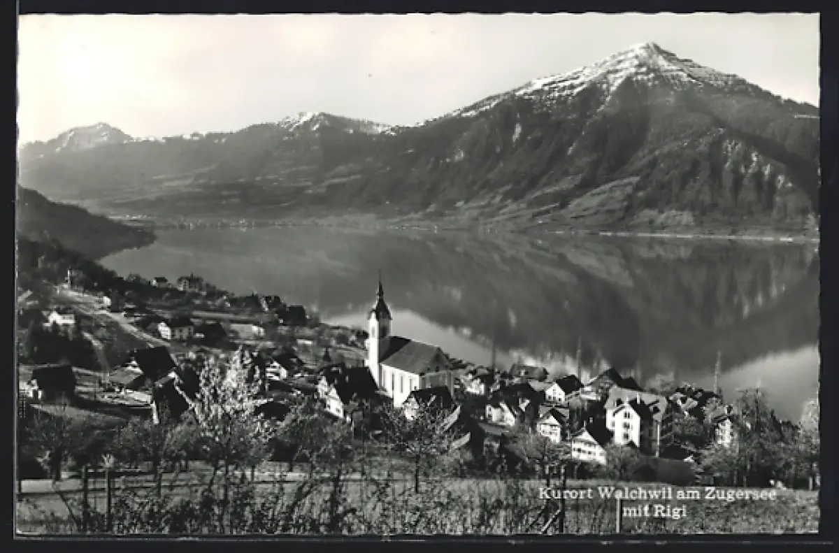 AK Walchwil am Zugersee, Teilansicht mit Kirche und Rigi