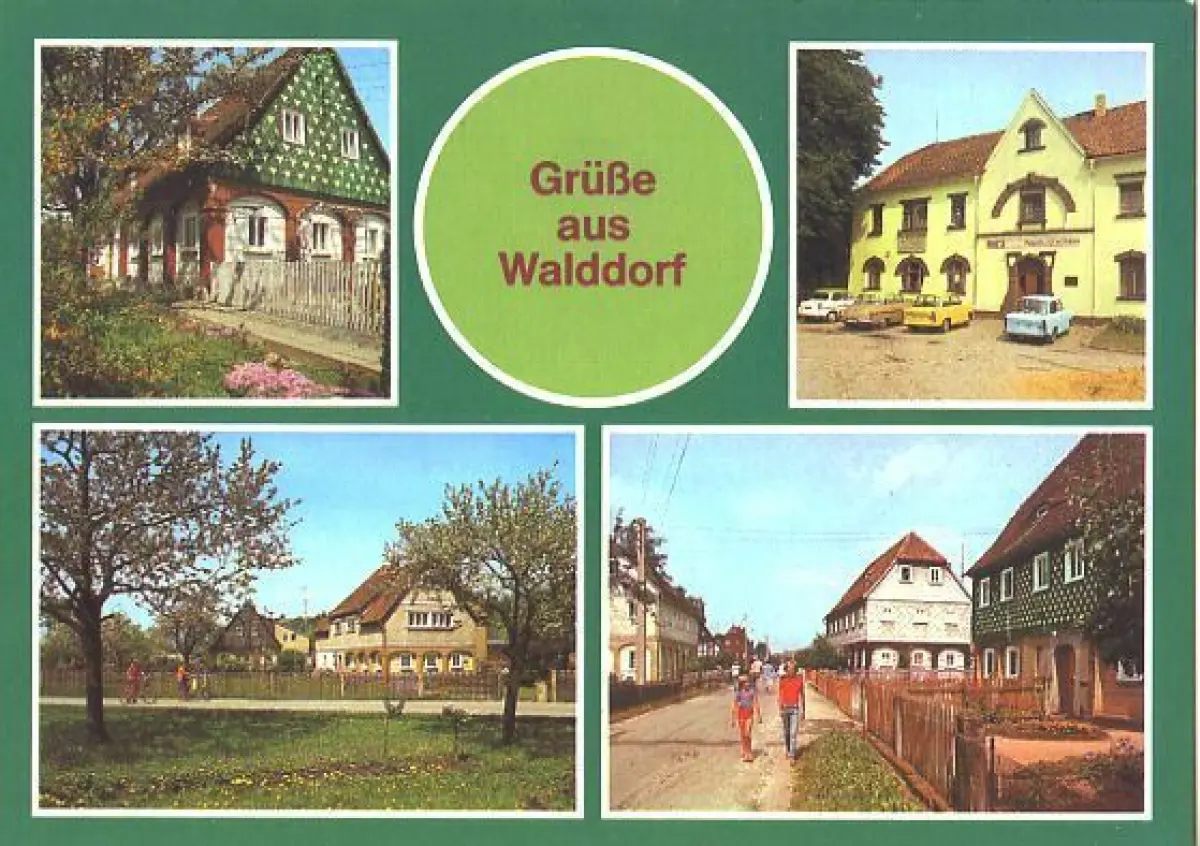 Ansichtskarte, Walddorf, Kr. Löbau, 4 Abb., Umgebindehaus, Konsum-Gaststätte Waldkretscham, 2x Straßenansichten, Druckjahr: 1985 Erhaltung 1-2, ungelaufen Verlag: Bild und Heimat, Reichenbach - 01 12 0852/10