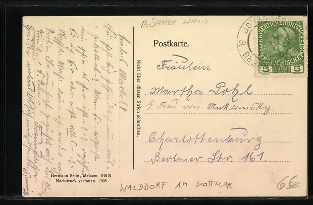 Personenbezogene Daten auf der Rückseite der Karte wurden durch blauen Textmarker unkenntlich gemacht. Die blauen Stellen sind auf die Vorderseite durchgeweicht und wirken sich negativ auf das Postkartenfoto aus