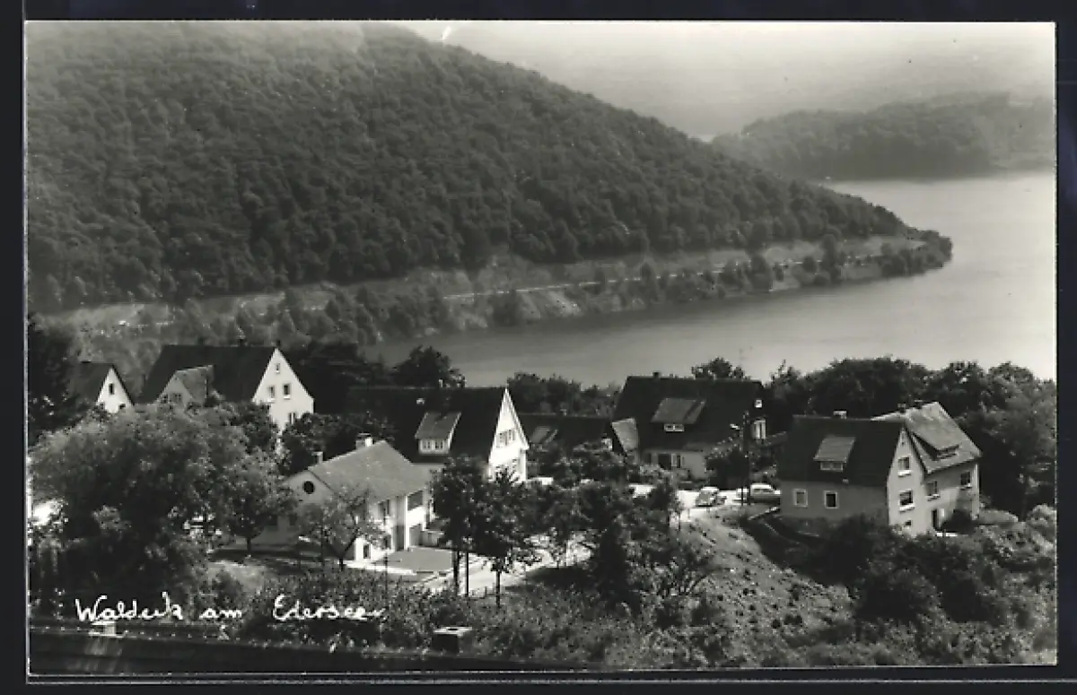 AK Waldeck am Edersee, Ortsansicht mit See und umliegenden Häusern
