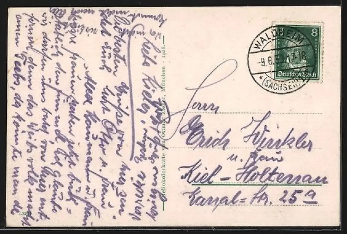 Personenbezogene Daten auf der Rückseite der Karte wurden durch blauen Textmarker unkenntlich gemacht. Die blauen Stellen sind auf die Vorderseite durchgeweicht und wirken sich negativ auf das Postkartenfoto aus