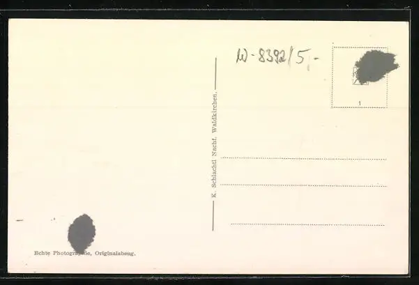 Personenbezogene Daten auf der Rückseite der Karte wurden durch blauen Textmarker unkenntlich gemacht. Die blauen Stellen sind auf die Vorderseite durchgeweicht und wirken sich negativ auf das Postkartenfoto aus