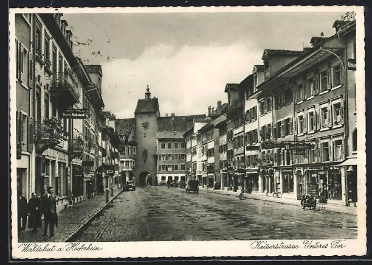 AK Waldshut, Kaiserstrasse, Unteres Tor mit Geschäften