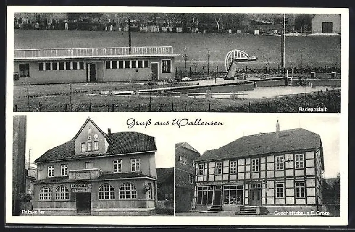 AK Wallensen, Badeanstalt, Ratskeller, Geschäftshaus E. Grote