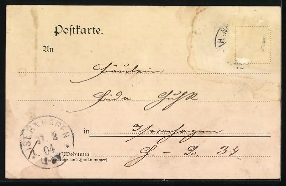 gelaufen 1904, Briefmarke entfernt, rückseitig Oberflächenschaden, sonst guter Zustand