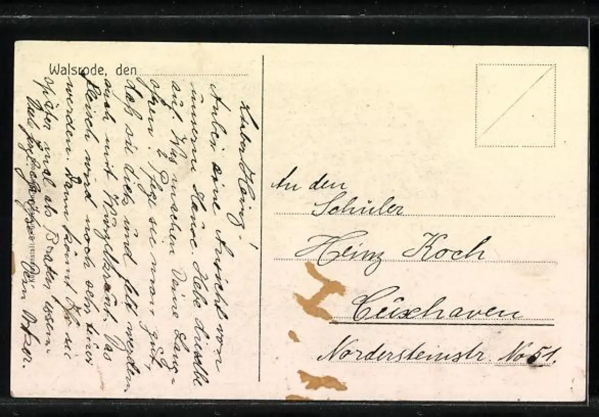 Personenbezogene Daten auf der Rückseite der Karte wurden durch blauen Textmarker unkenntlich gemacht. Die blauen Stellen sind auf die Vorderseite durchgeweicht und wirken sich negativ auf das Postkartenfoto aus