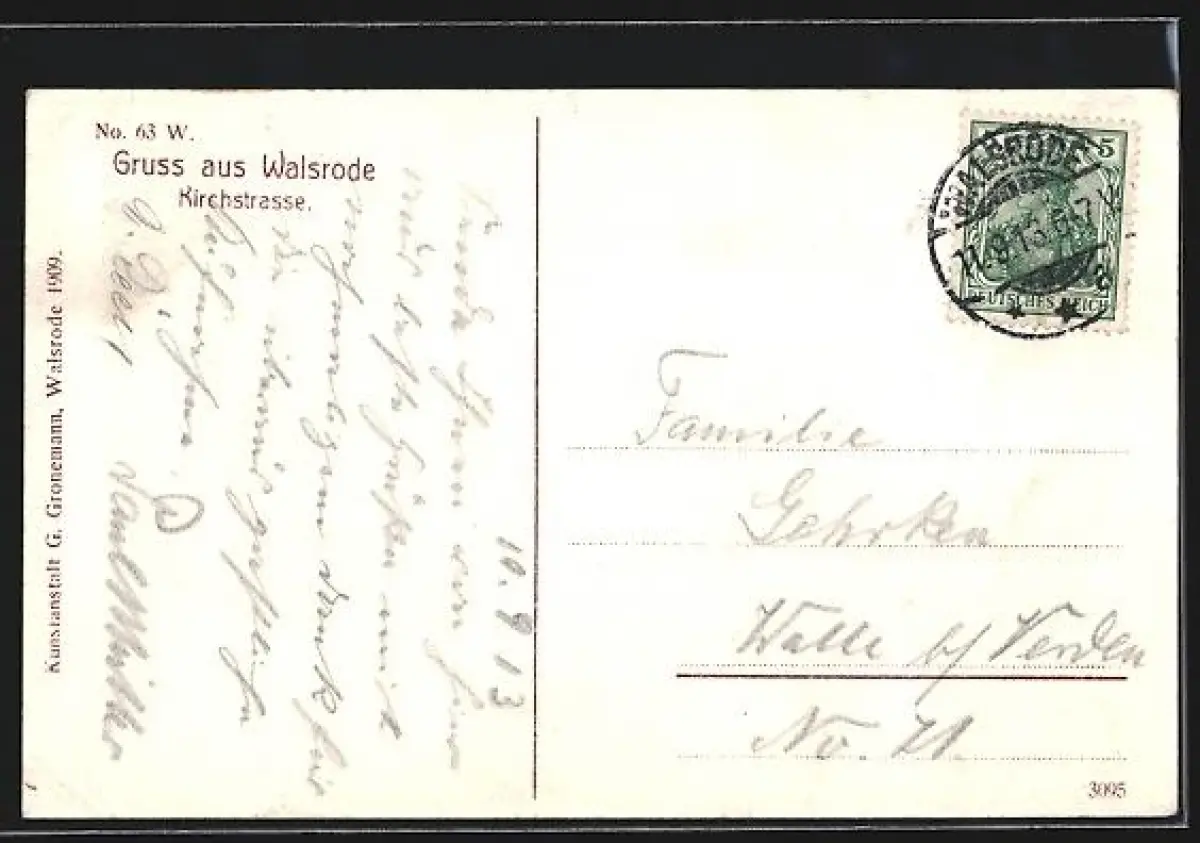 Personenbezogene Daten auf der Rückseite der Karte wurden durch blauen Textmarker unkenntlich gemacht. Die blauen Stellen sind auf die Vorderseite durchgeweicht und wirken sich negativ auf das Postkartenfoto aus