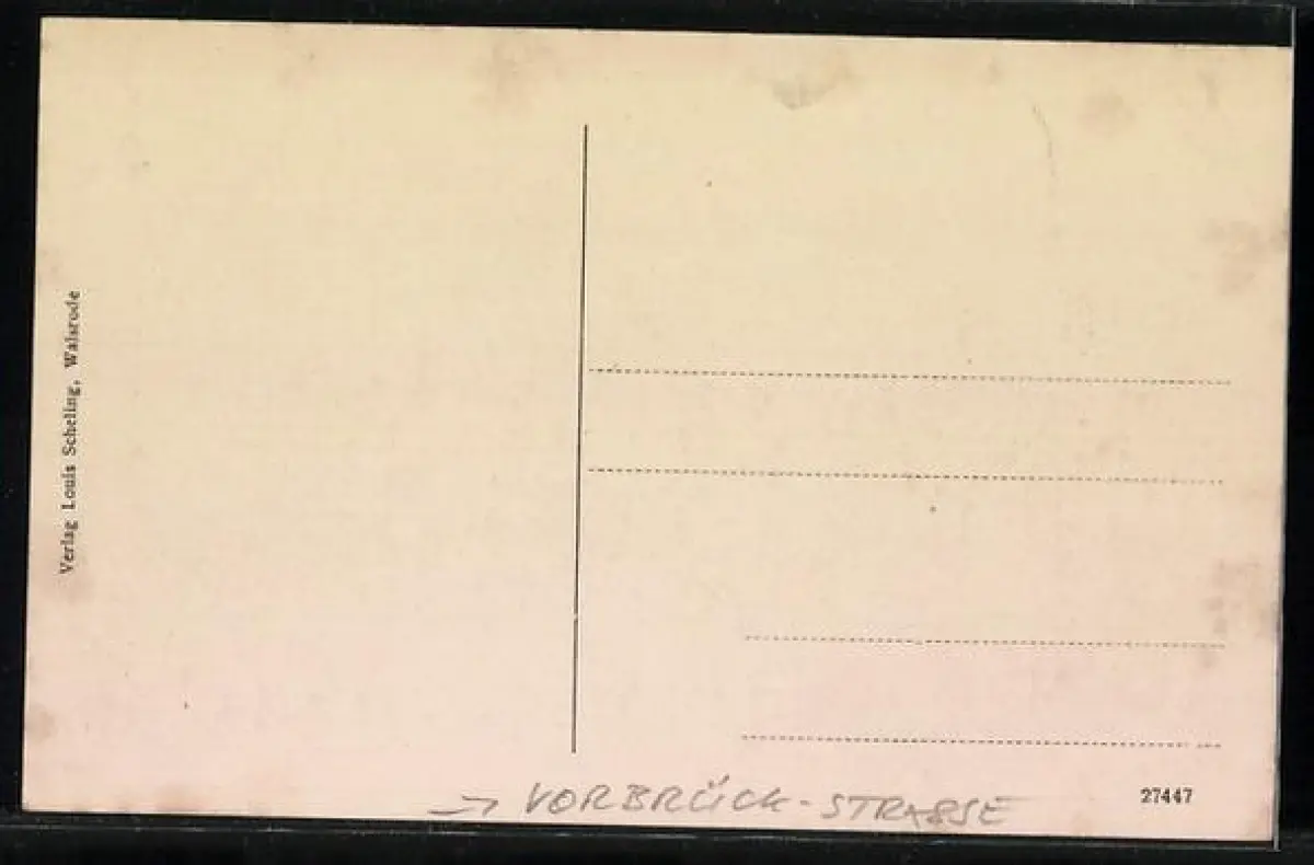 Personenbezogene Daten auf der Rückseite der Karte wurden durch blauen Textmarker unkenntlich gemacht. Die blauen Stellen sind auf die Vorderseite durchgeweicht und wirken sich negativ auf das Postkartenfoto aus