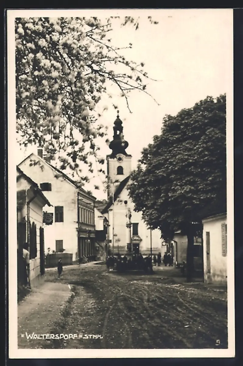 AK Waltersdorf /Stmk., Strassenpartie mit Kirche