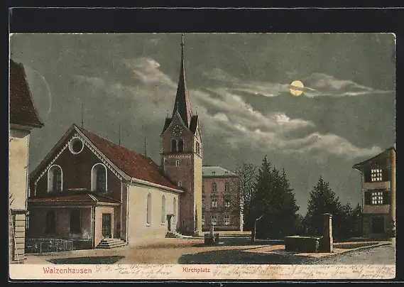 AK Walzenhausen, Kirchplatz mit Kirche bei Mondschein
