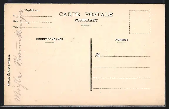 Personenbezogene Daten auf der Rückseite der Karte wurden durch blauen Textmarker unkenntlich gemacht. Die blauen Stellen sind auf die Vorderseite durchgeweicht und wirken sich negativ auf das Postkartenfoto aus