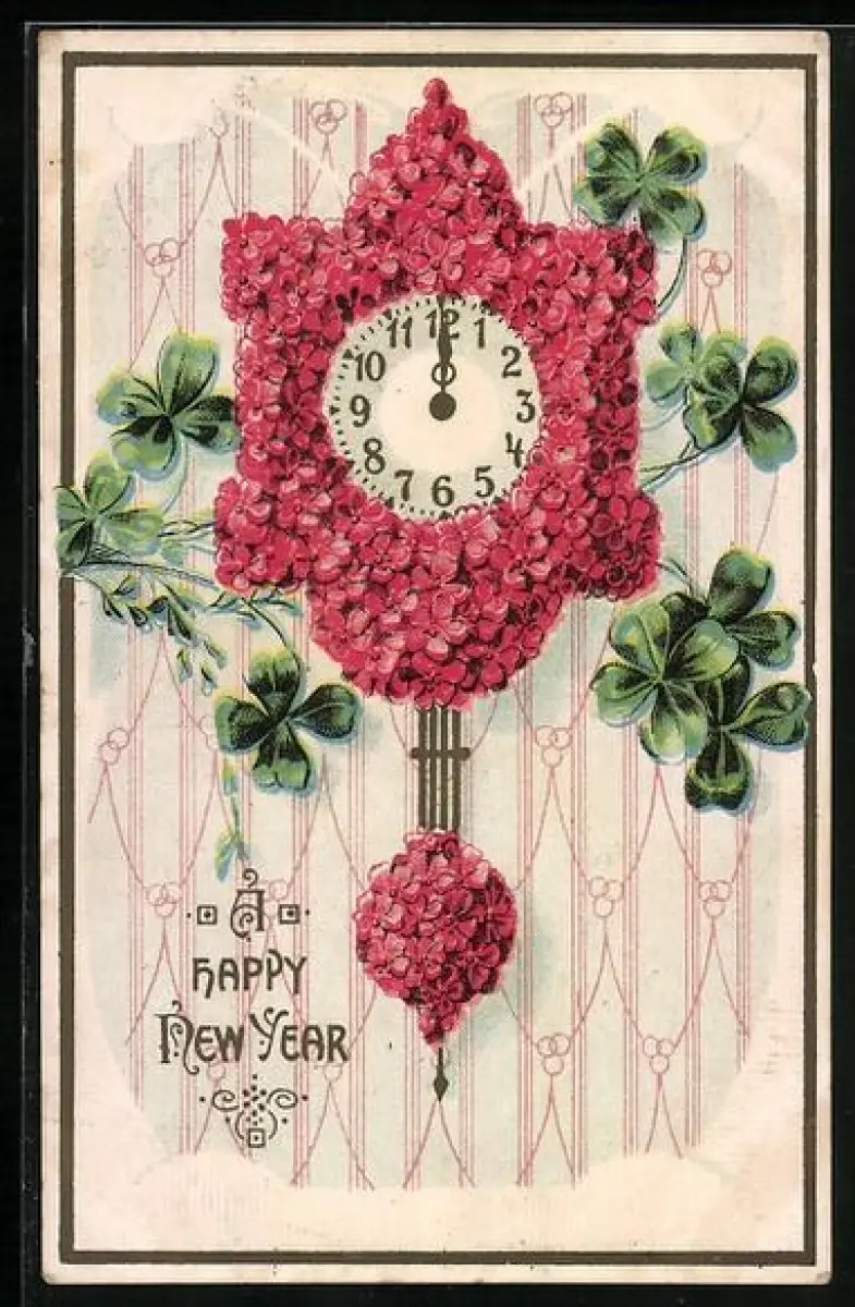 AK Wand-Blumenuhr mit Glücksklee, Neujahrsgruss
