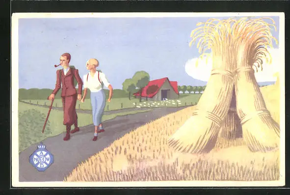 AK Wanderer entlang von Weizenfeldern wandernd