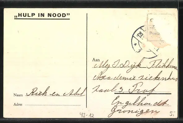 Personenbezogene Daten auf der Rückseite der Karte wurden durch blauen Textmarker unkenntlich gemacht. Die blauen Stellen sind auf die Vorderseite durchgeweicht und wirken sich negativ auf das Postkartenfoto aus