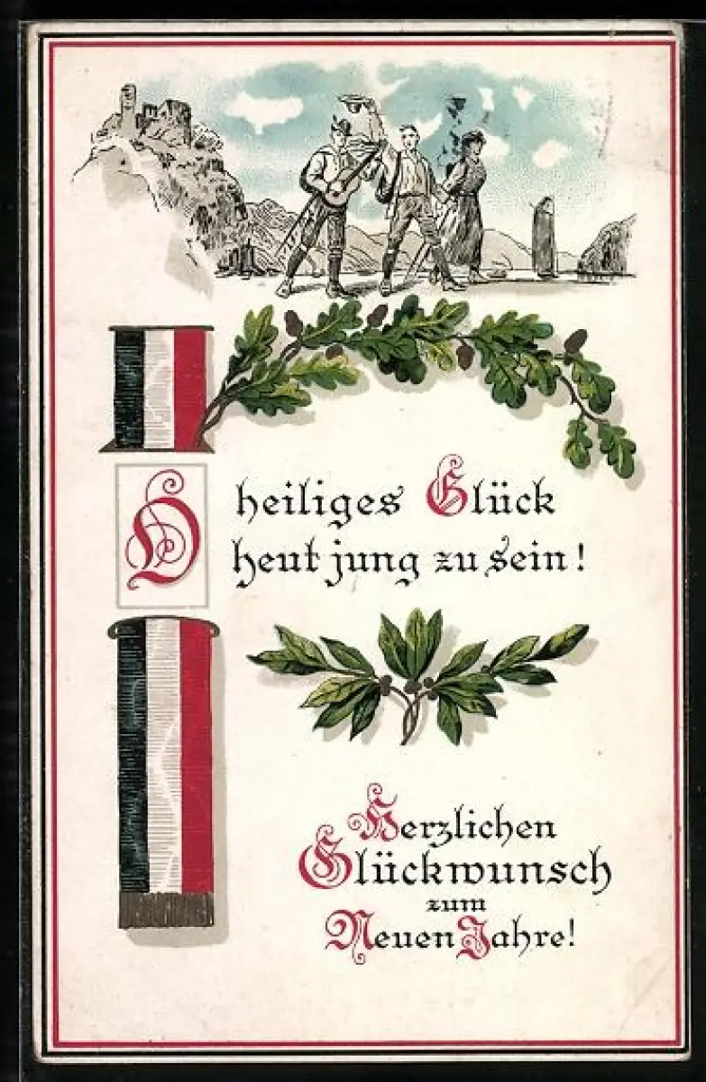 AK Wanderer senden Neujahrswünsche, Reichsflagge, Heiliges Glück, heut jung zu sein!