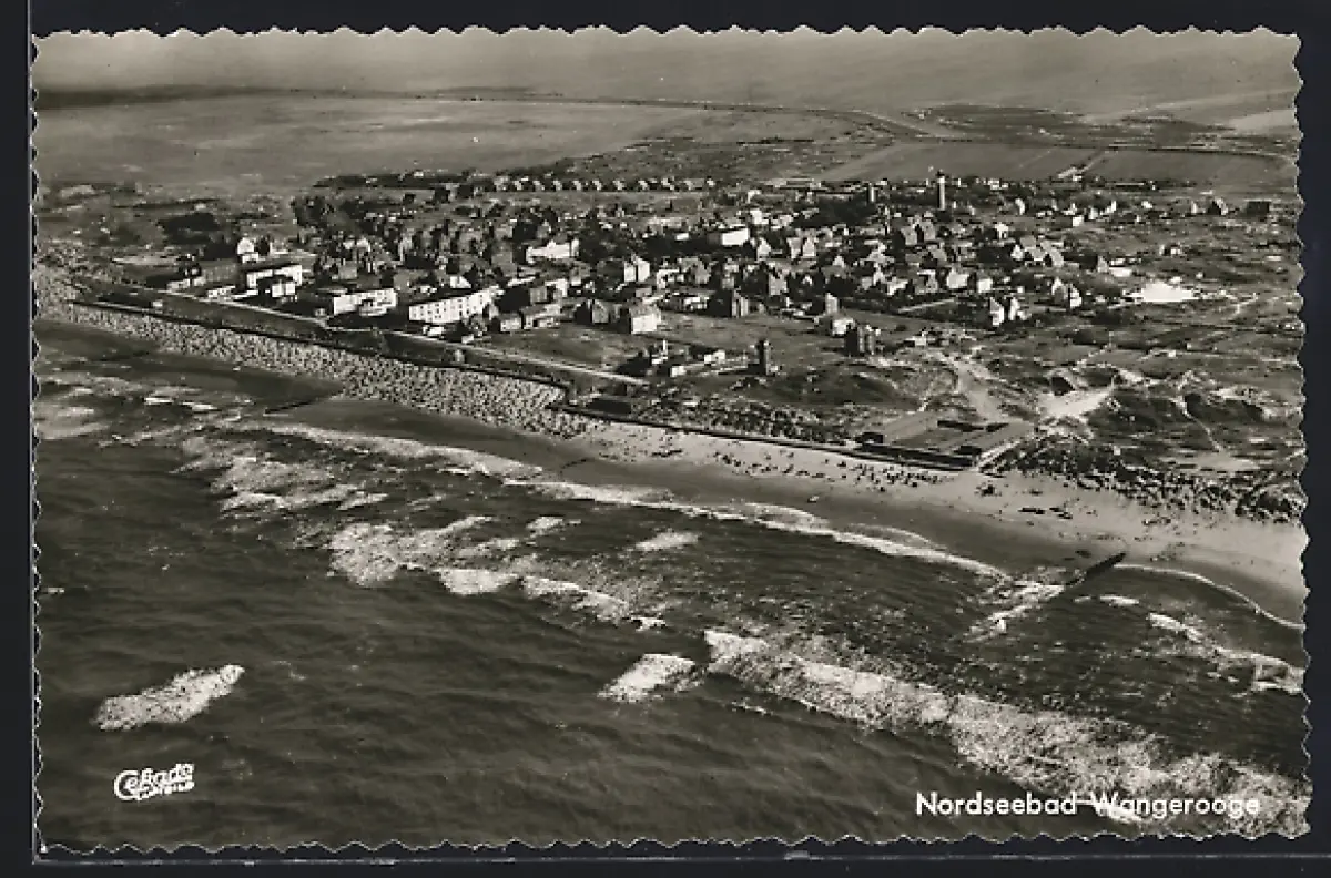 AK Wangerooge, Luftaufnahme Ort und Küstenlinie