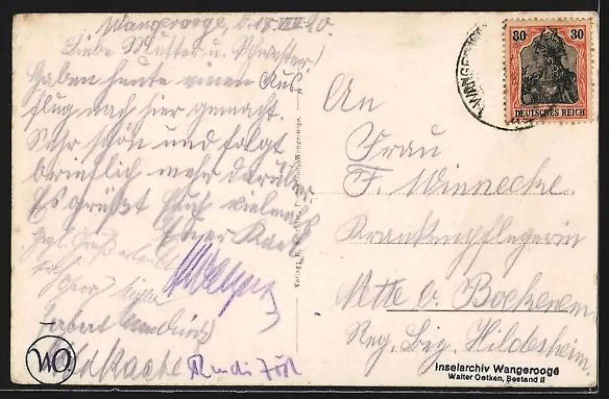 Personenbezogene Daten auf der Rückseite der Karte wurden durch blauen Textmarker unkenntlich gemacht. Die blauen Stellen sind auf die Vorderseite durchgeweicht und wirken sich negativ auf das Postkartenfoto aus