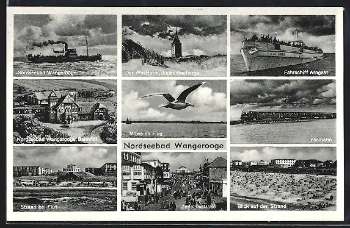 AK Wangerooge, Westturm, Bahnhof, Strand, Zedeliusstrasse, Fährschiff Arngast, Inselbahn