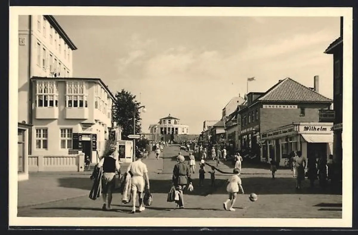 AK Wangerooge, Zedeliusstrasse, Strassenszene mit Geschäften und Passanten
