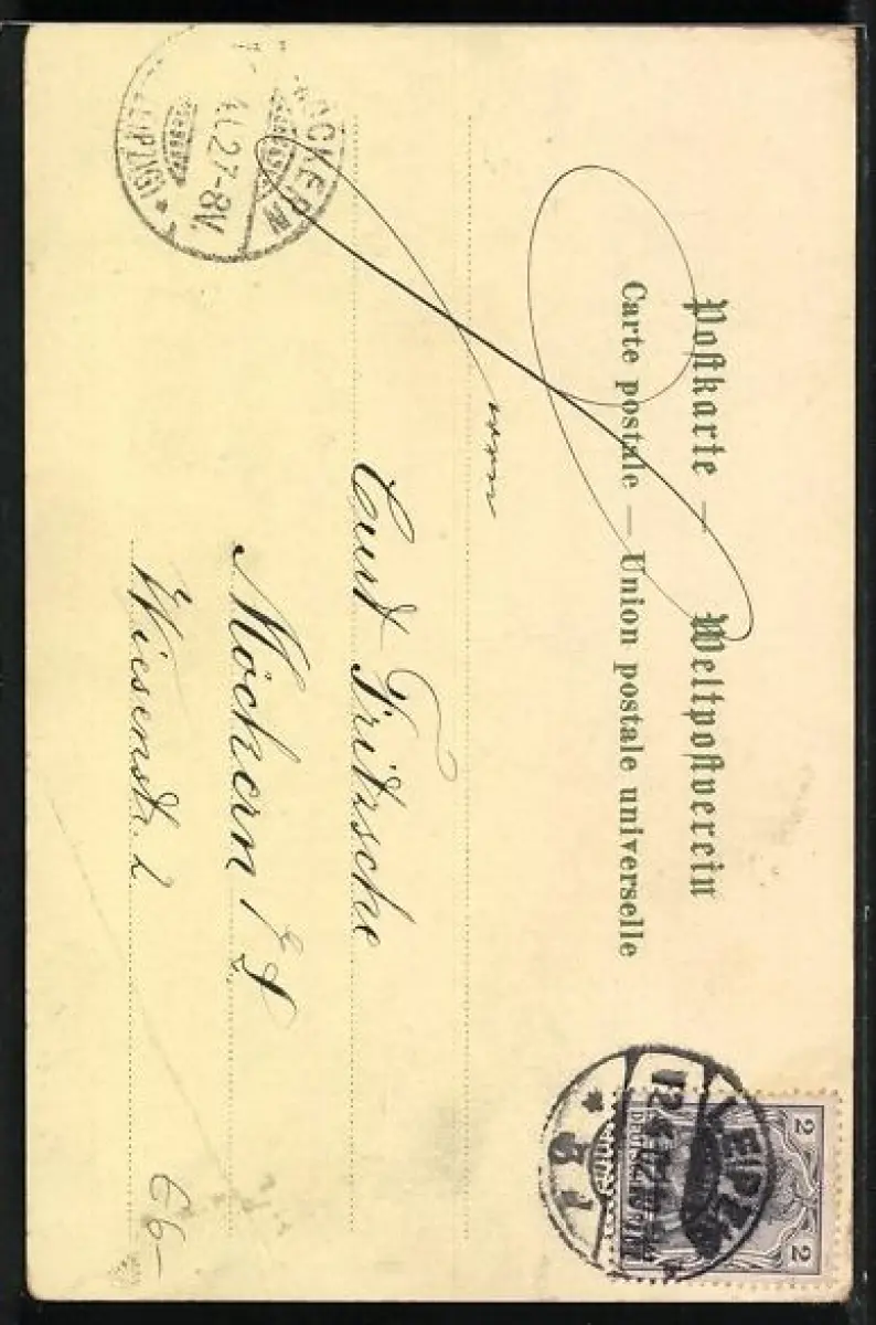 alte Ansichtskarte, gelaufen 1902, Eckknick li. oben, Bugspur re. unten, guter Zustand