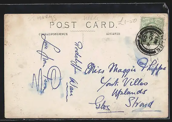 Personenbezogene Daten auf der Rückseite der Karte wurden durch blauen Textmarker unkenntlich gemacht. Die blauen Stellen sind auf die Vorderseite durchgeweicht und wirken sich negativ auf das Postkartenfoto aus