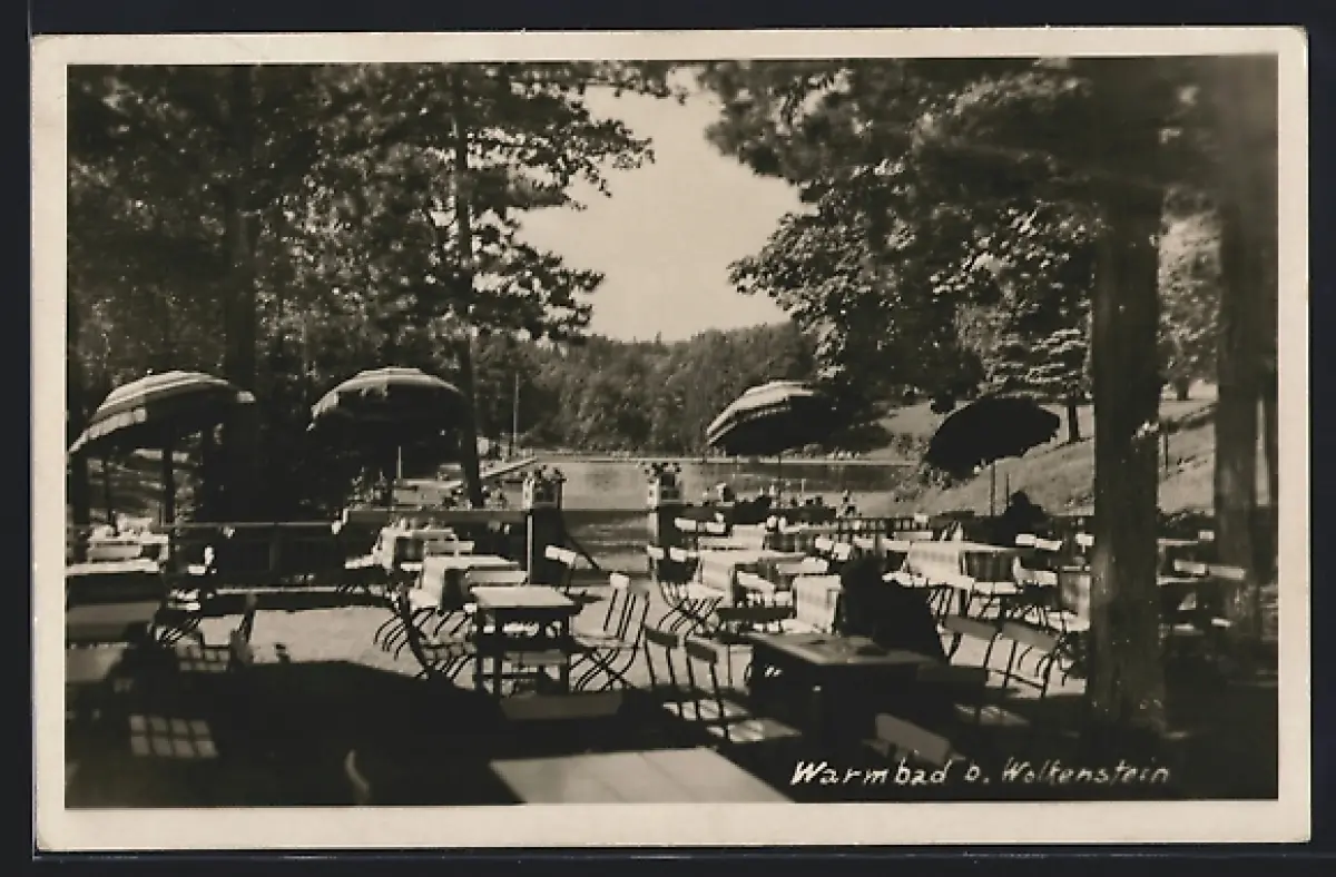 AK Warmbad b. Wolkenstein, Gasthaus-Terrasse mit Tischen und Sonnenschirmen