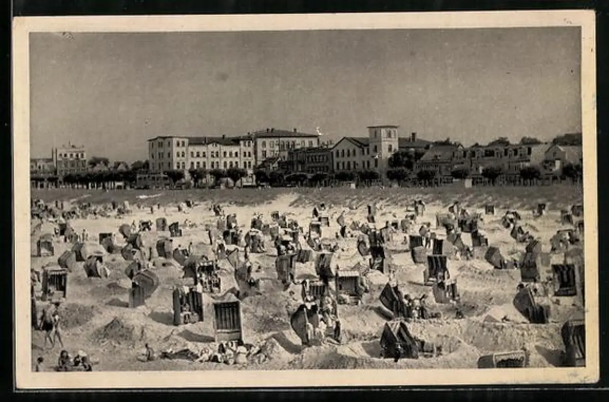 AK Warnemünde, Strand mit Strandkörben und Promenade