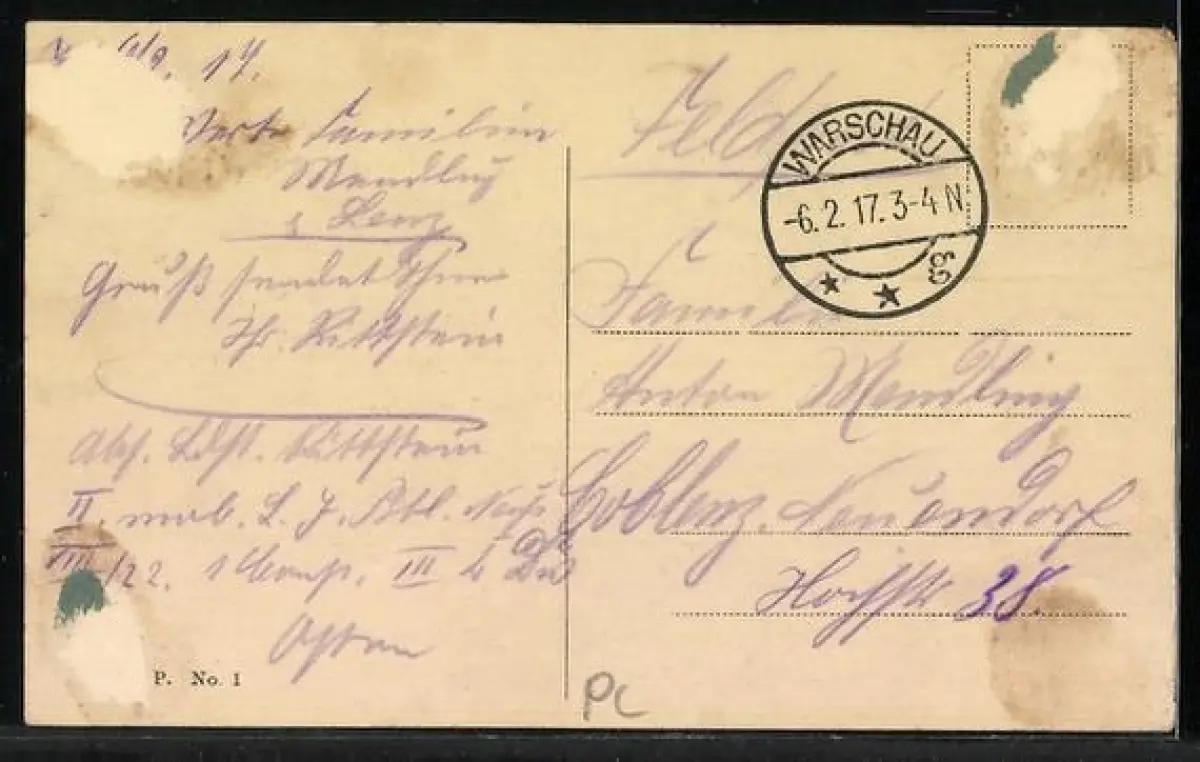 gelaufen 1917, Briefmarke entfernt, rückseitig Klebe- und Papierreste, rückseitig Oberflächenschaden