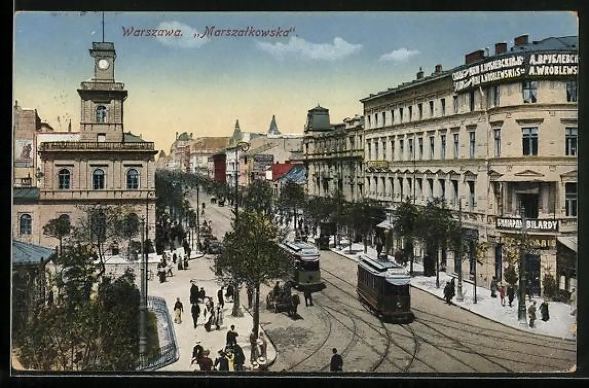AK Warschau-Warszawa, Marszatkowska, Strassenansicht mit Strassenbahnen