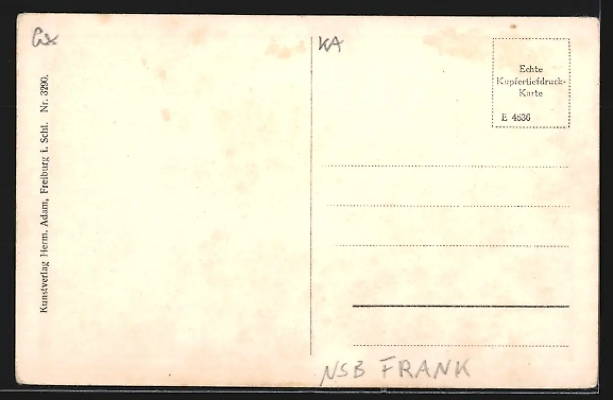 Personenbezogene Daten auf der Rückseite der Karte wurden durch blauen Textmarker unkenntlich gemacht. Die blauen Stellen sind auf die Vorderseite durchgeweicht und wirken sich negativ auf das Postkartenfoto aus