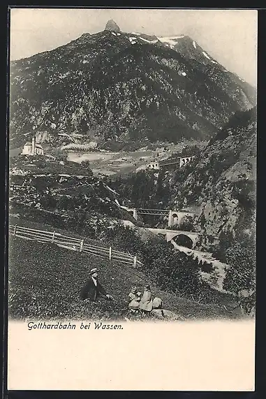 AK Wassen, Panoramaansicht mit Gotthardbahn, Mann und Mädchen rasten