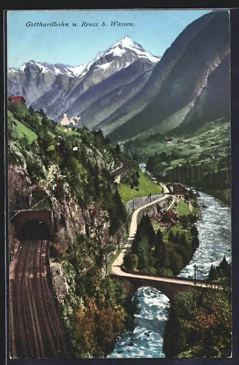 AK Wassen, Reuss mit Gotthardbahn