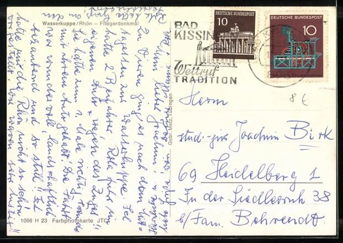 Personenbezogene Daten auf der Rückseite der Karte wurden durch blauen Textmarker unkenntlich gemacht. Die blauen Stellen sind auf die Vorderseite durchgeweicht und wirken sich negativ auf das Postkartenfoto aus
