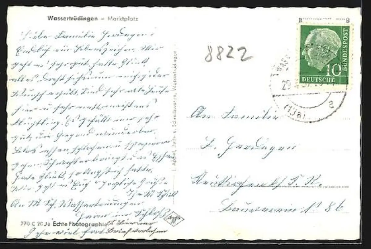 Personenbezogene Daten auf der Rückseite der Karte wurden durch blauen Textmarker unkenntlich gemacht. Die blauen Stellen sind auf die Vorderseite durchgeweicht und wirken sich negativ auf das Postkartenfoto aus