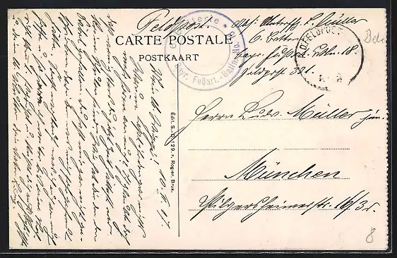 Personenbezogene Daten auf der Rückseite der Karte wurden durch blauen Textmarker unkenntlich gemacht. Die blauen Stellen sind auf die Vorderseite durchgeweicht und wirken sich negativ auf das Postkartenfoto aus