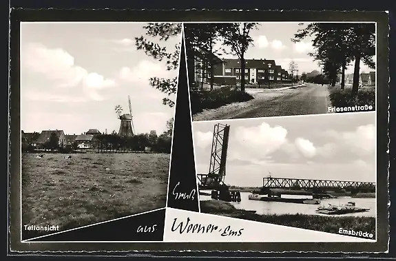 AK Weener /Ems, Friesenstrasse, Emsbrücke, Teilansicht mit Windmühle