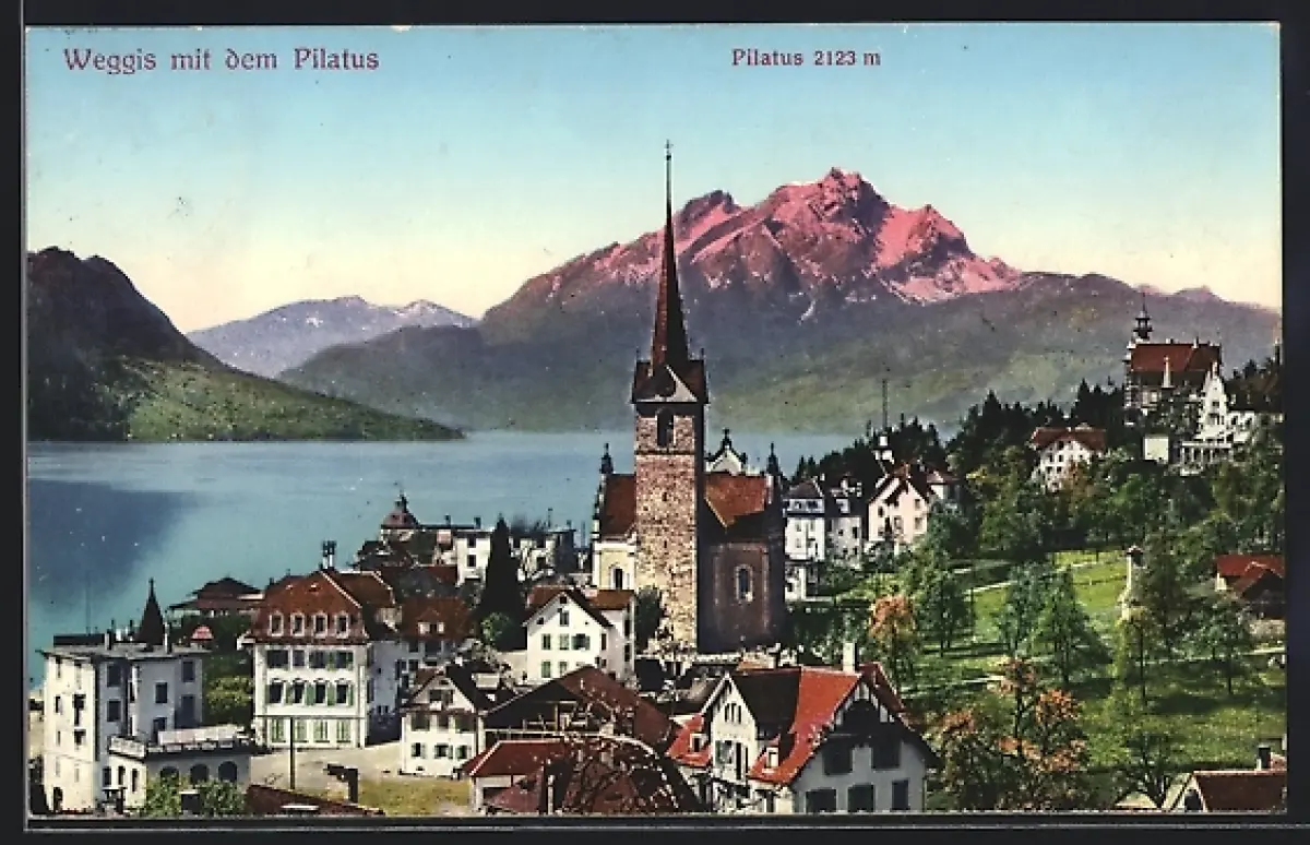 AK Weggis, Blick auf den Ort mit Kirche und Berg Pilatus