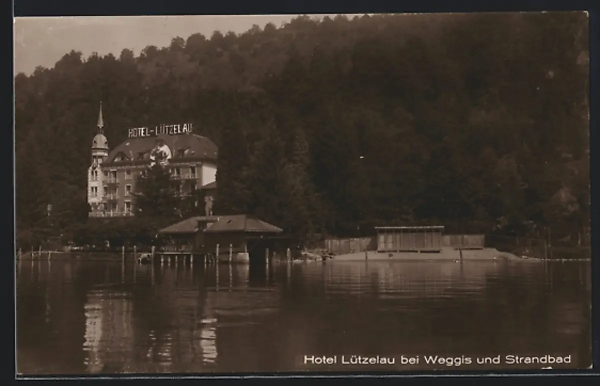 AK Weggis, Hotel Lützelau und Strandbad vom Wasser aus gesehen