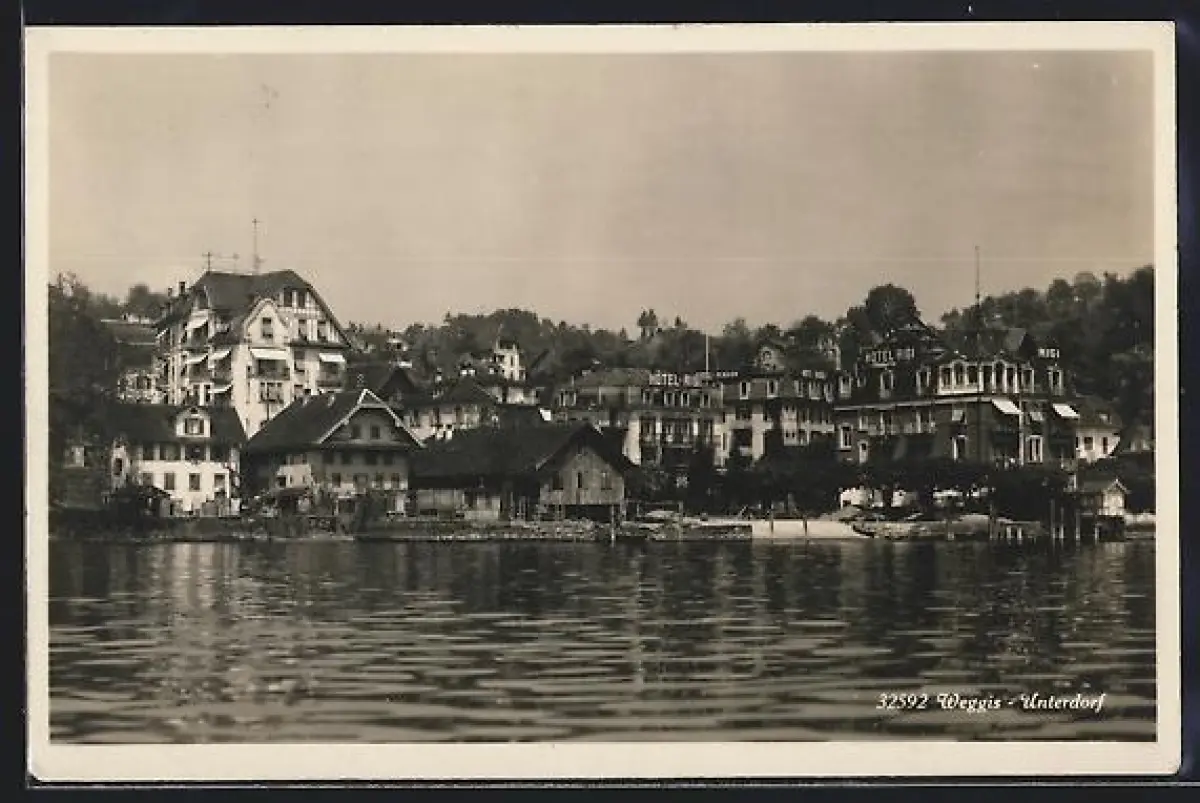 AK Weggis-Unterdorf, Uferpartie mit Hotel Rigi