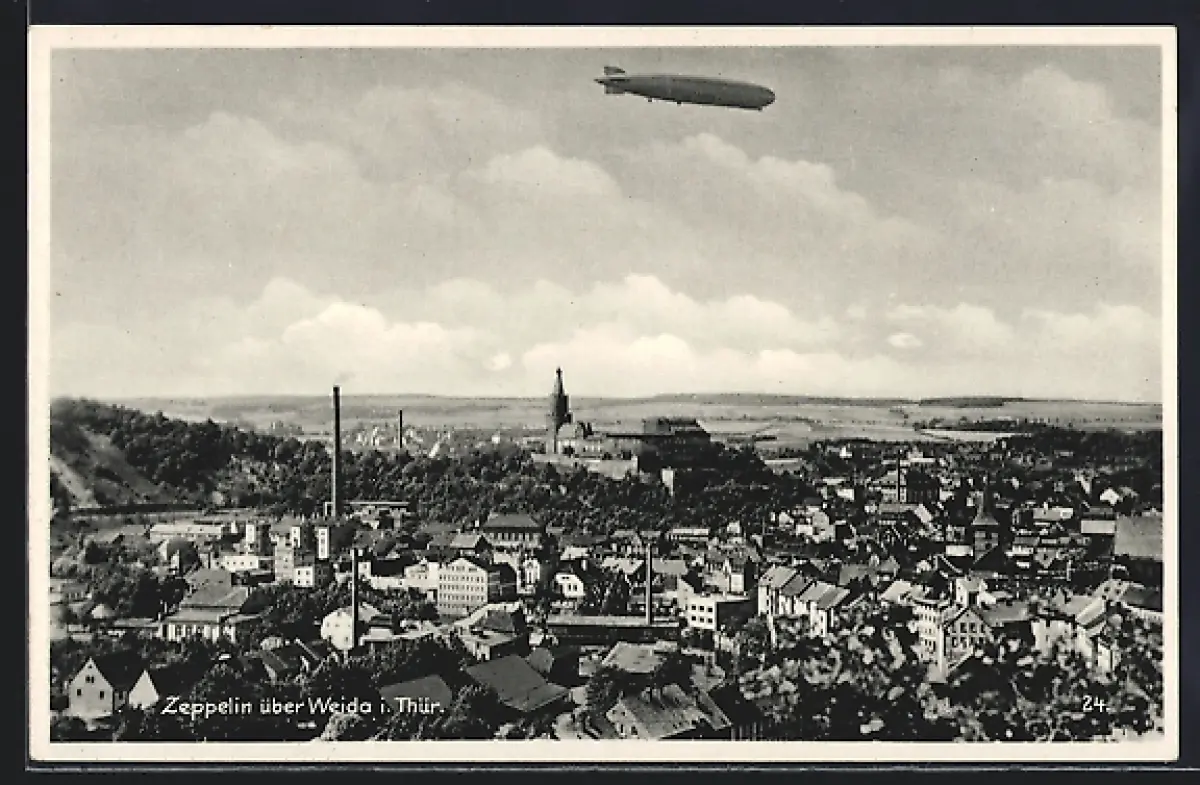 AK Weida / Thür., Zeppelin Luftschiff über der Stadt